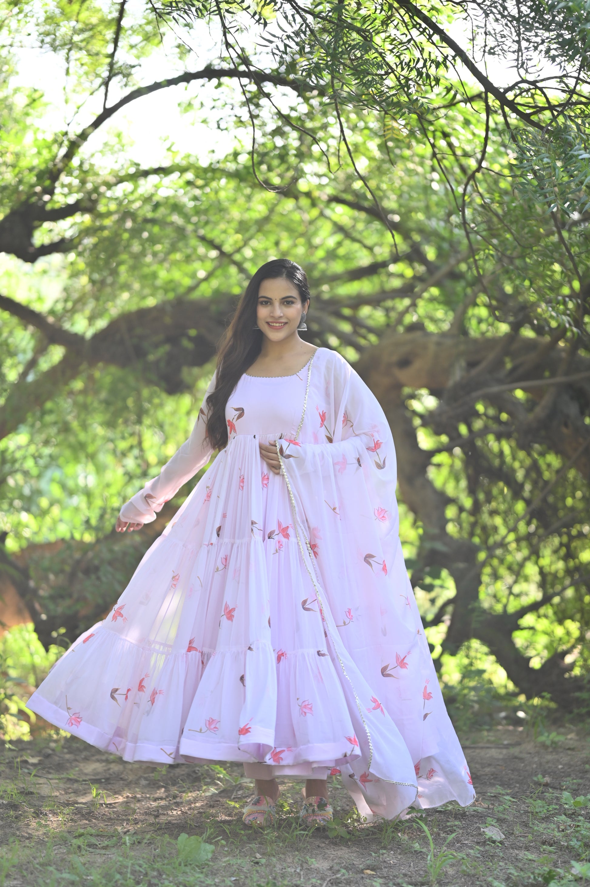 Presenting Soft Pink floral Printed chiffon tiered pattern Anarkali with matching Chiffon dupatta and cotton Pants . The Soft Pink shade and lotus flower print is such a breathtaking combination.