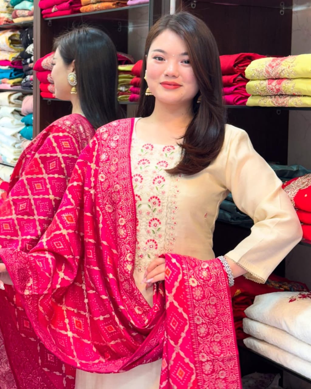 This beautiful cream-colored straight kurta set comes adorned with delicate thread embroidery, perfectly paired with a vibrant blue Bandhej dupatta featuring intricate ethnic motifs and zari border. A classic fusion of subtle and striking, perfect for festive days and family occasions.