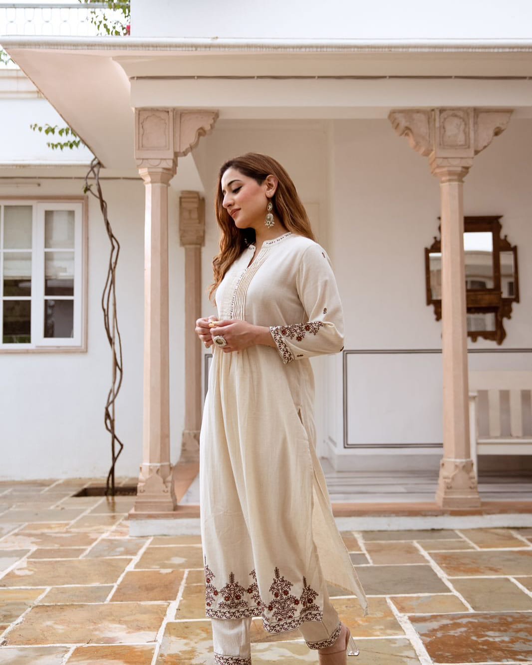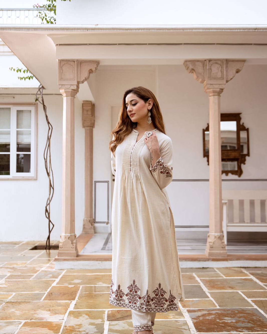 Grace meets simplicity in this ivory-hued kurta set, adorned with intricate maroon thread embroidery on the sleeves, hemline, and pants. Crafted in soft cotton fabric, it offers breathable comfort and timeless charm — perfect for both everyday elegance and festive moments. Pair it with oxidized jewelry for a complete ethnic look.