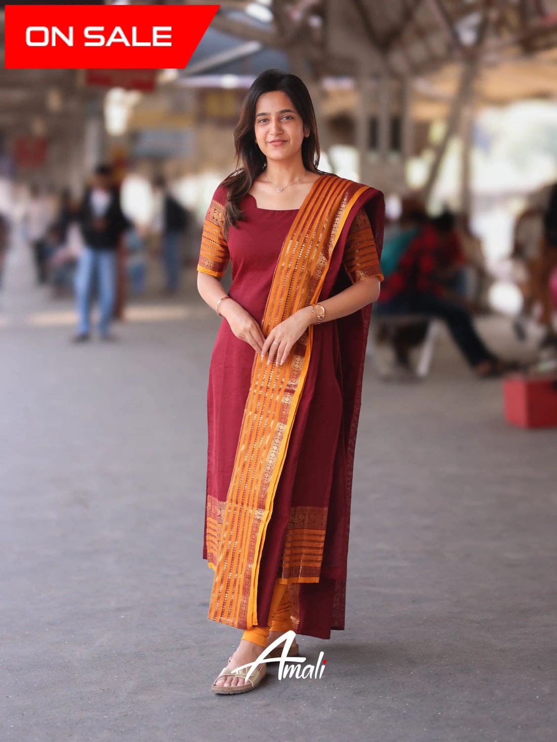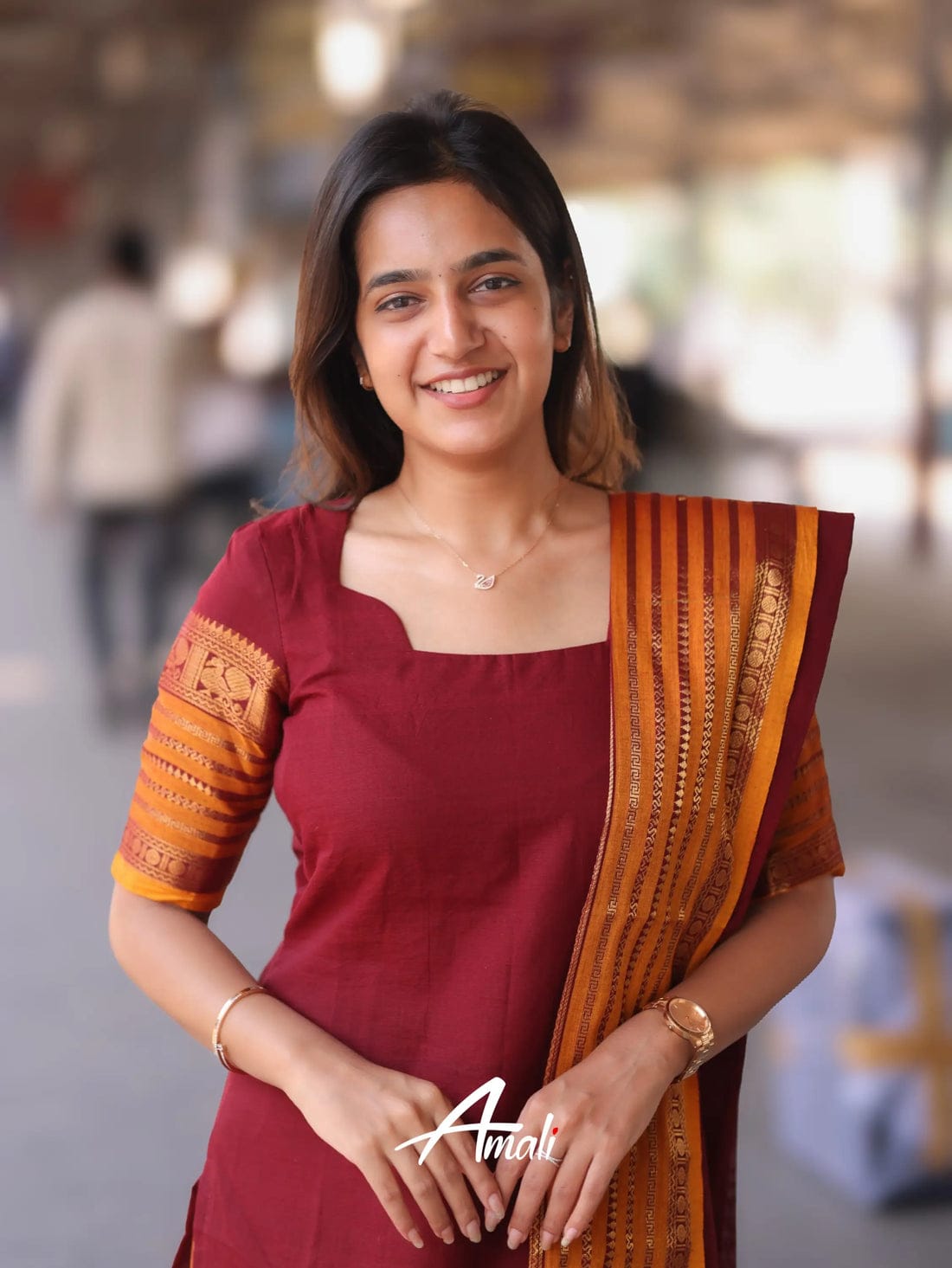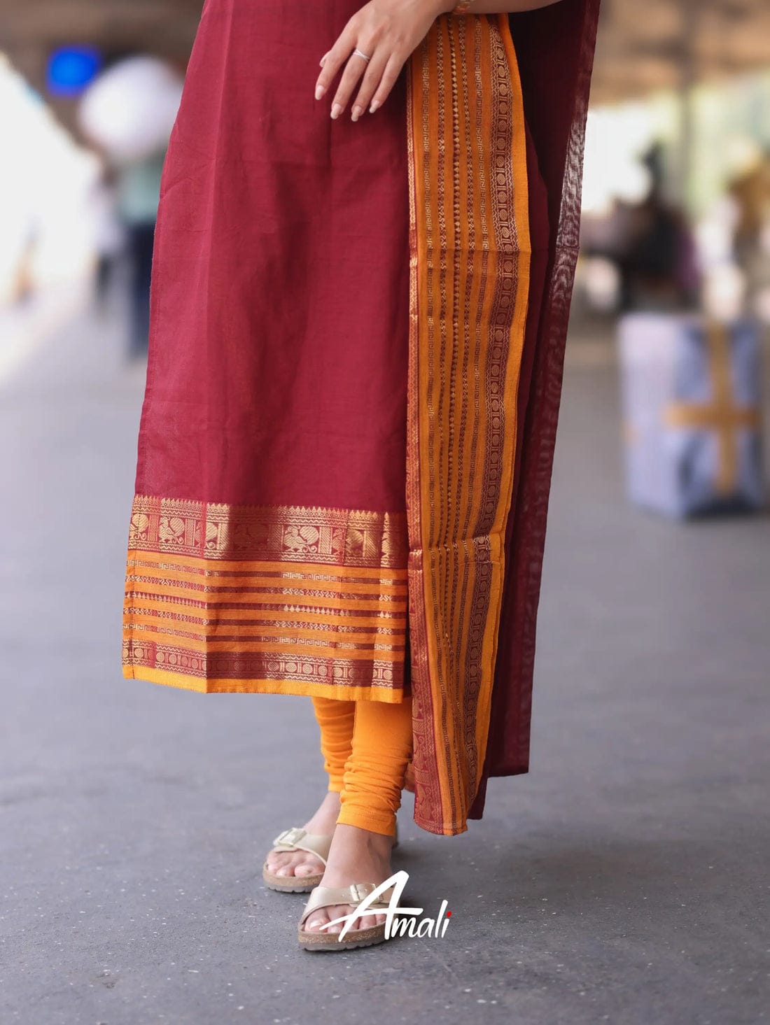 Drape yourself in the elegance of South Indian heritage with this navy blue cotton suit set. Featuring rich zari borders on the kurta and dupatta, the look is effortlessly regal. The contrasting teal churidar adds a refreshing pop of color, while the handwoven-style dupatta brings tradition to life. Perfect for cultural events, festive outings, or graceful everyday wear.