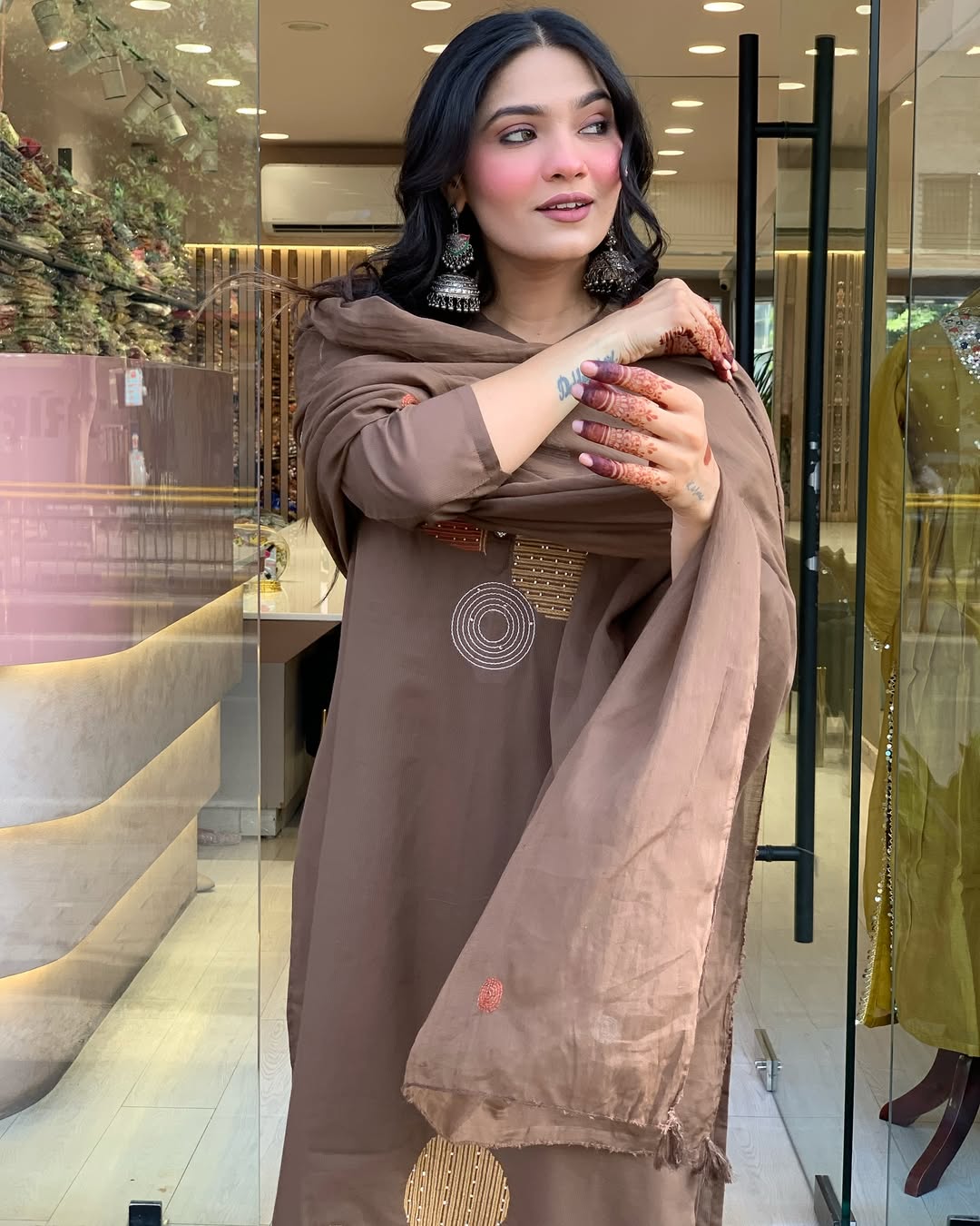 Premium Quality Pure Cotton Embroidered Ben Neck Kurti Pant Dupatta Set
